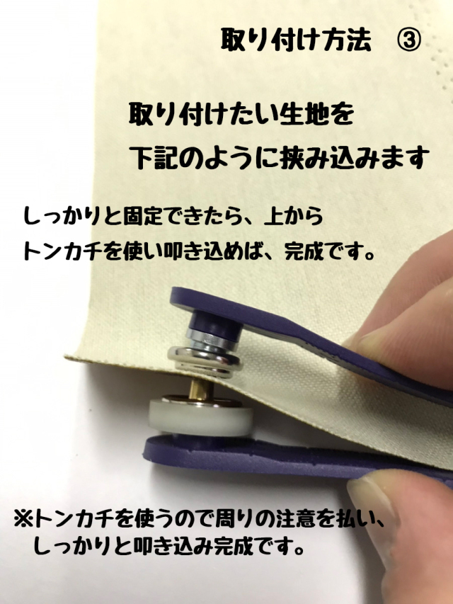 ・オス側取り付け時:受け皿にボタンの突起が内側にくるよう乗せ、生地の穴へ通し上からオス側の土台を乗せる。